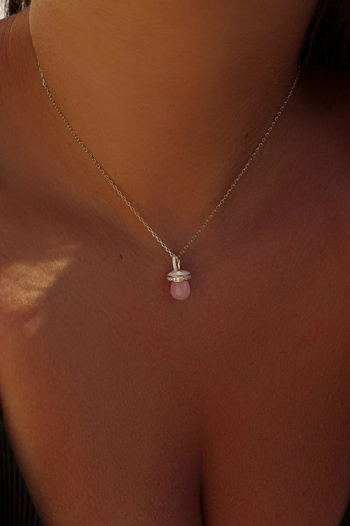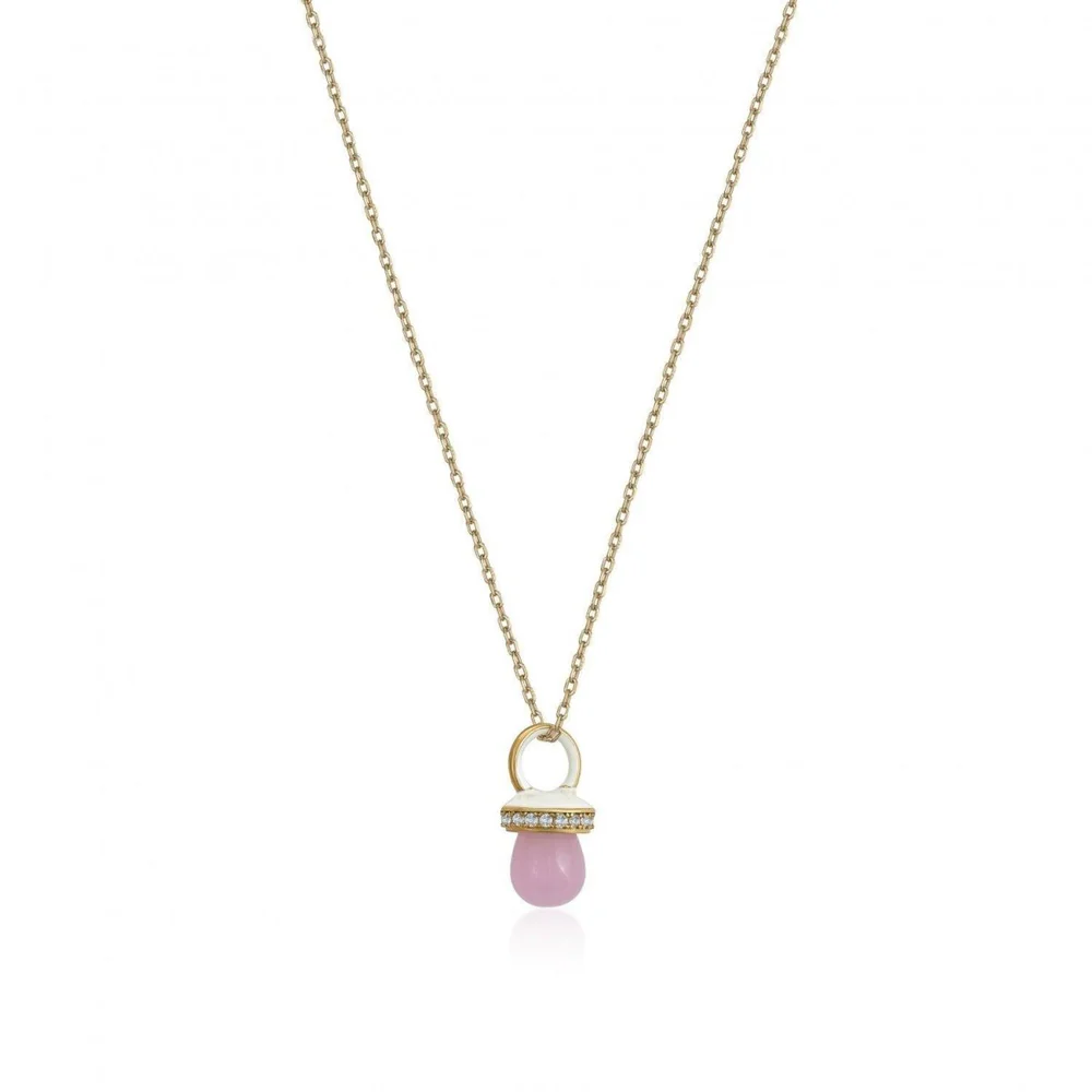 Colgantes plata originales para mujer. Un diseño atrevido para romper con lo establecido. Colgante original de plata bañada en oro con motivo de chupete con piedra semipreciosa cuarzo rosa como la parte inferior del chupete y la superior está formada por esmalte blanco y circonitas blancas engastadas. ¿Te atreves a añadir un toque juguetón a tu outfit?