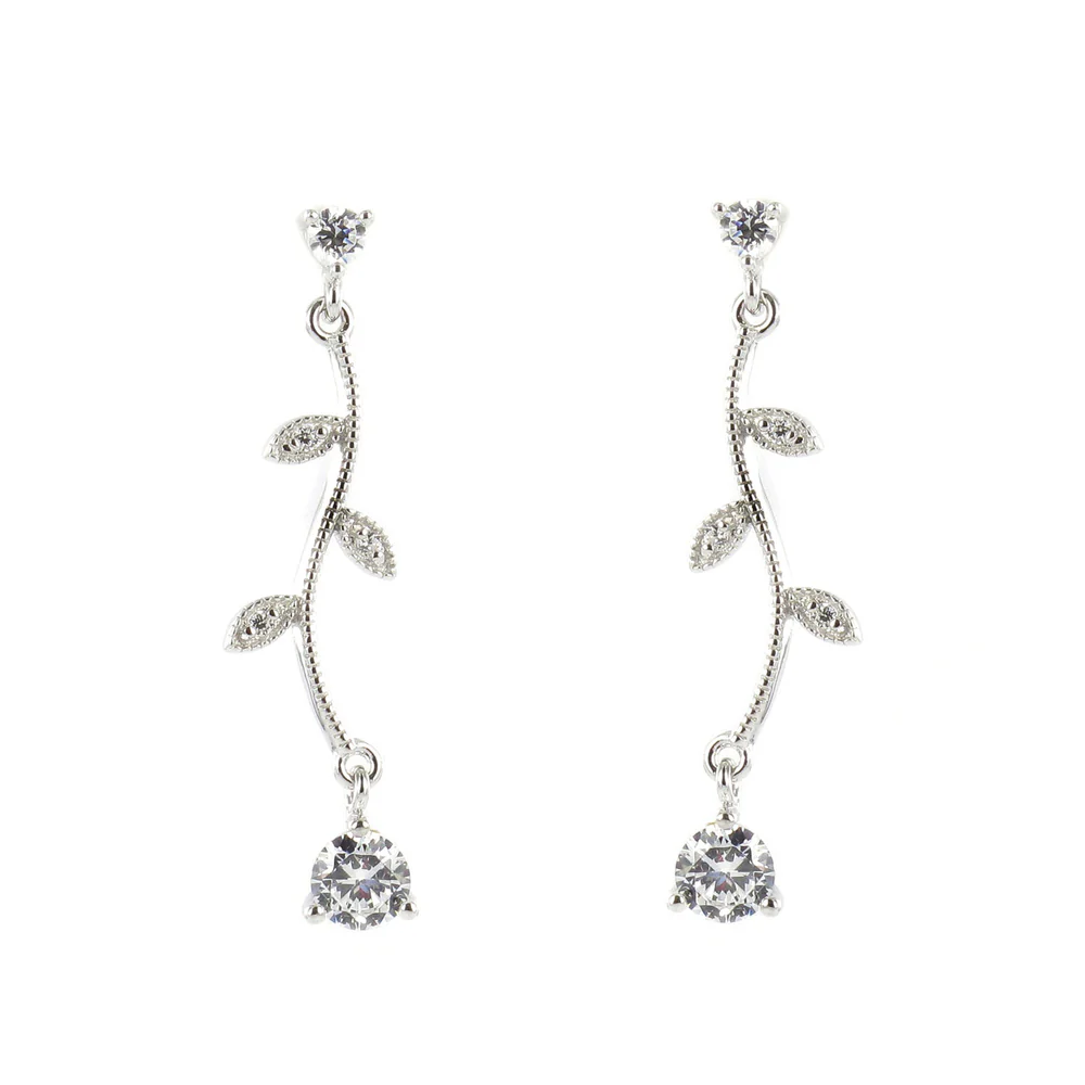 Pendientes largos finos diseño nature con circonita. Pendientes originales que darán a tus outfits el toque elegante que necesitas. Pendientes largos de plata con diseño de rama de árbol con circonitas en el contorno y en el extremo inferior. ¡Una joya simple pero muy elegante!